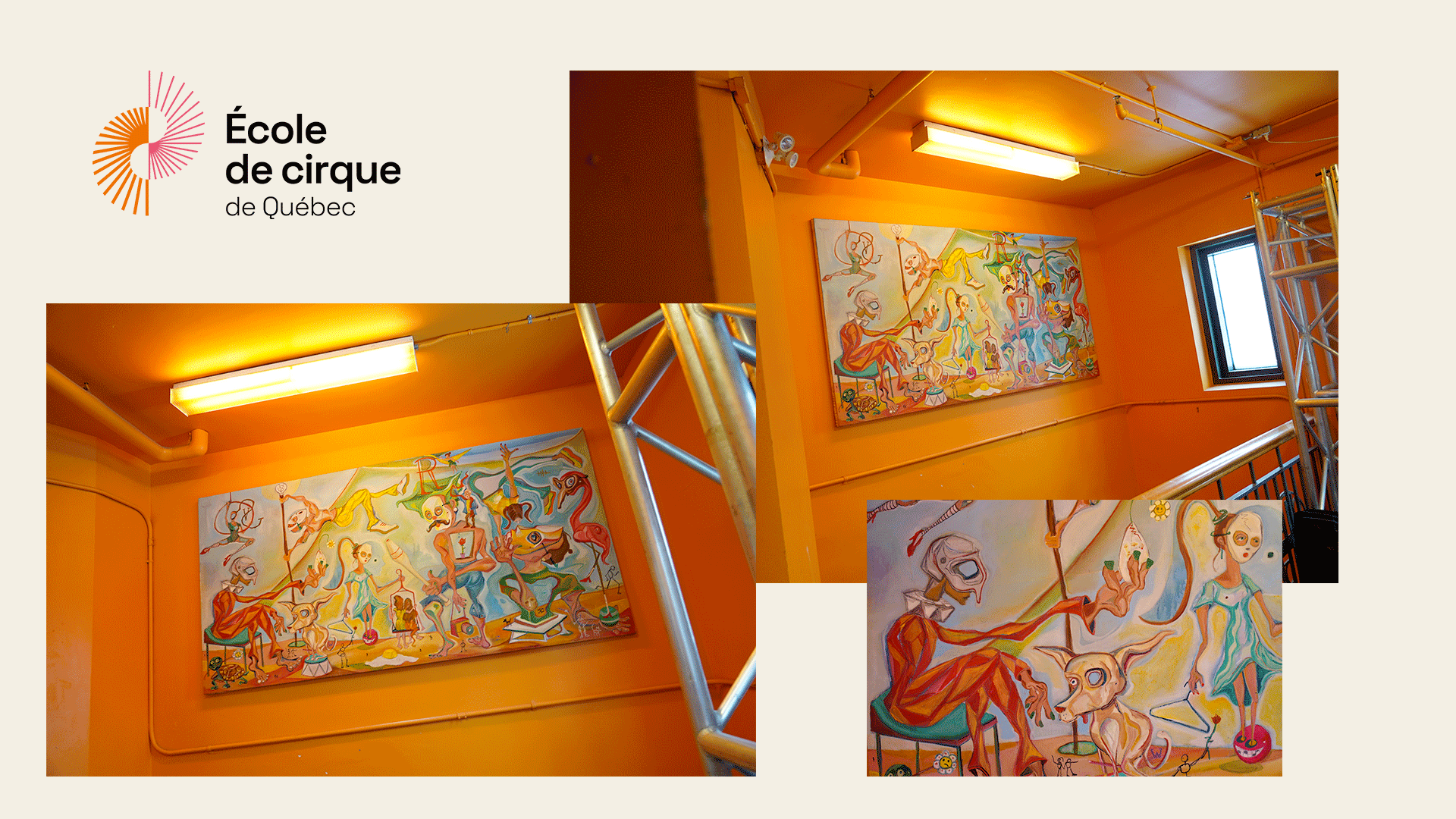 L’œuvre est une peinture à l’huile réalisée par l’artiste chilien Esteban Virumbrales, basé à Québec. Après avoir approché l’équipe il y a quelques mois pour lui faire part de son souhait de faire don de cette toile à l’école qu’il était encore en train de réaliser. Après quelques échanges, c’est assez naturellement que l’équipe a accepté et récupéré cette toile majeure, directement inspirée par d’anciens finissant.e.s que l’artiste avait fréquenté par le passé et mettant à l’honneur le cirque pour dans un si beau et grand format de toile. Plusieurs références personnelles à son approche artistique et sa vie ainsi que plusieurs références au cirque et à différentes disciplines ponctuent également son œuvre et c’est donc naturellement qu’il a pensé à l’école comme le meilleur lieu pour y faire vivre l’œuvre une fois terminée.
